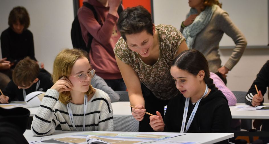 Les élèves se préparent en amont, en classe, à la dernière étape. Rassemblés par équipe, ils travaillent sur une devise et un blason.