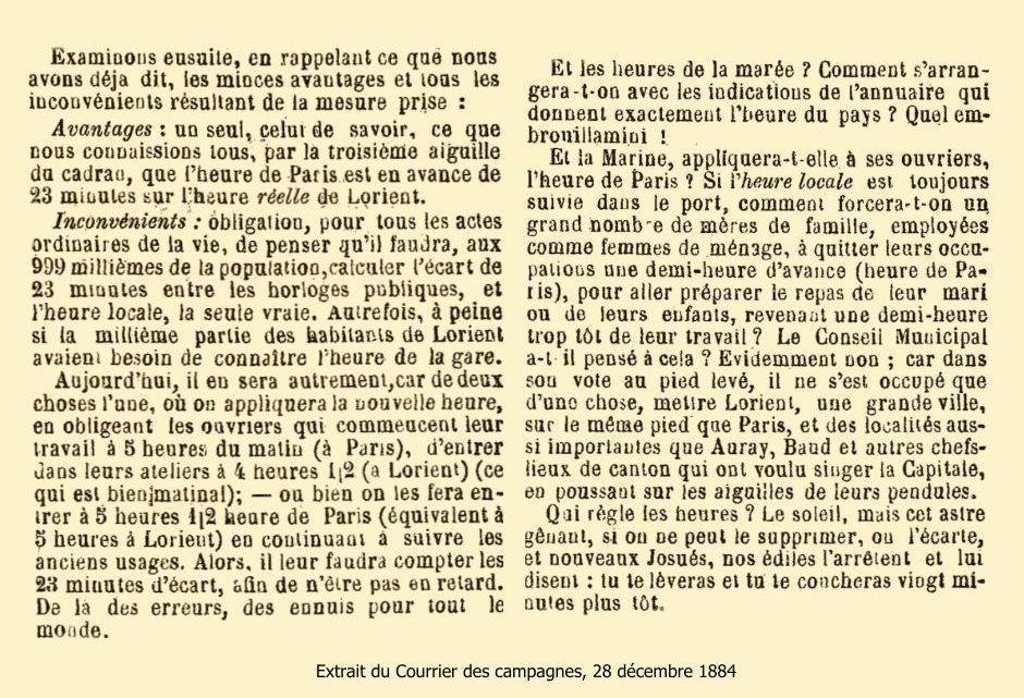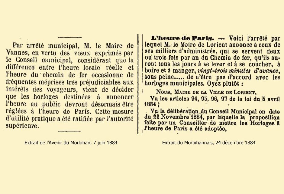 Remontons le temps. Avant la fin du 19e siècle, l'heure est une affaire locale : chaque clocher suit la course du soleil, créant un décalage de plusieurs minutes d'une ville à l'autre. Un véritable casse-tête pour les voyageurs en train ! Une 3e aiguille sur les cadrans publics indique alors l’heure de Paris. Pour plus de praticité, les villes desservies par le rail s’alignent progressivement sur l’heure de Paris comme Vannes en juin 1884. La ville de Lorient, qui comptait 23 minutes de retard sur l’heure de la Capitale, se rallie quelques mois plus tard, non sans mal, comme en témoigne la presse locale de l’époque. En 1891, une loi met fin à cette diversité en imposant aux derniers territoires récalcitrants l'heure de Paris à l'ensemble de la France.