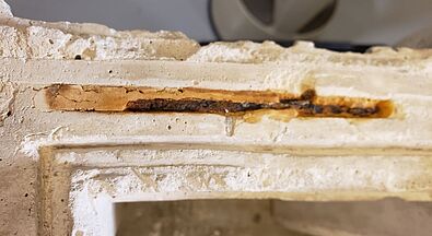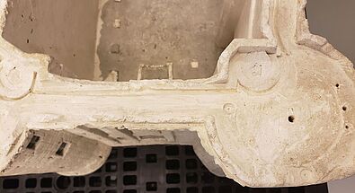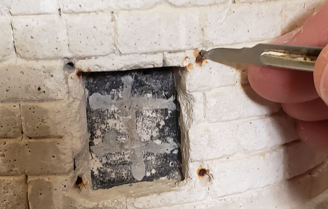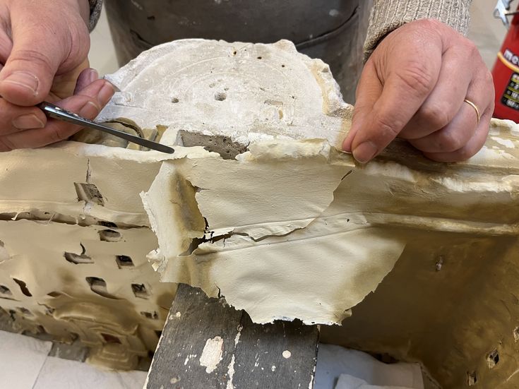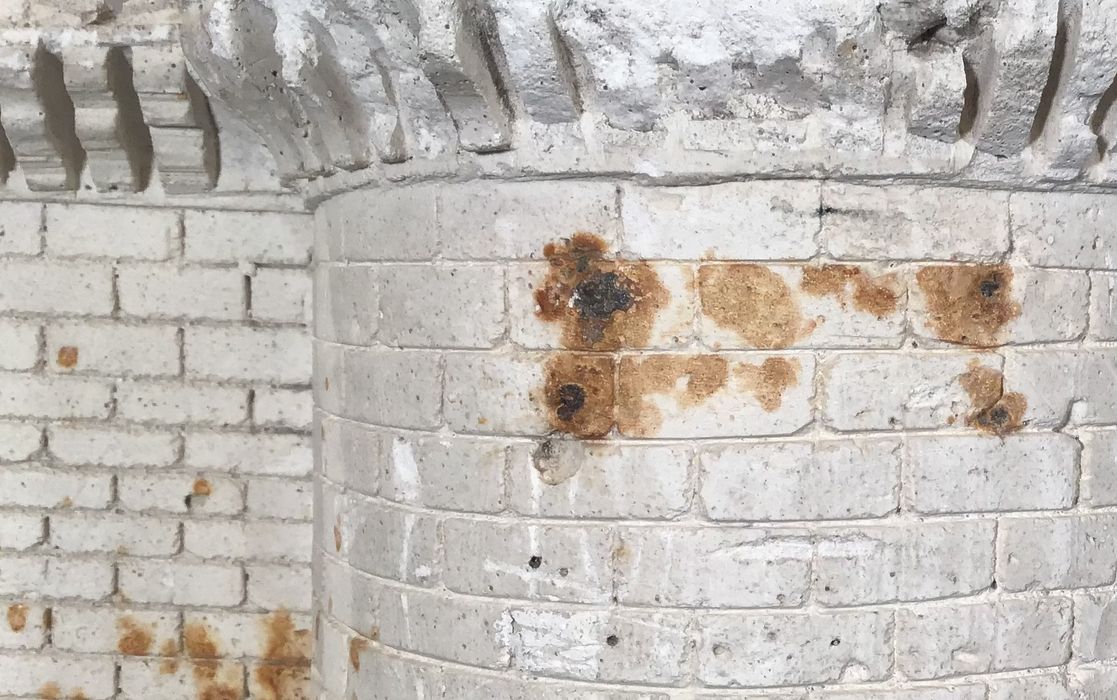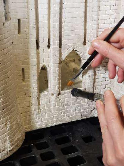 La maquette avait été moulée en deux parties réunies avec des agrafes métalliques. Celles-ci devenues en partie visibles se sont oxydées. Il a donc été nécessaire de les traiter afin de stopper la corrosion avant de les isoler sous un mastic.