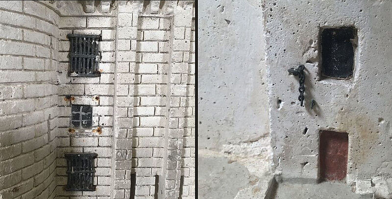 La maquette conserve cependant quelques détails montrant la minutie de l’œuvre originelle. Ainsi, un morceau de verre a été disposé au fonds du puits pour simuler la présence d’eau. Un crochet est présent sur un mur en hauteur de la petite cour. Une chaîne brisée fixée au-dessus de la petite porte de la chapelle dans la grande cour subsiste(note).