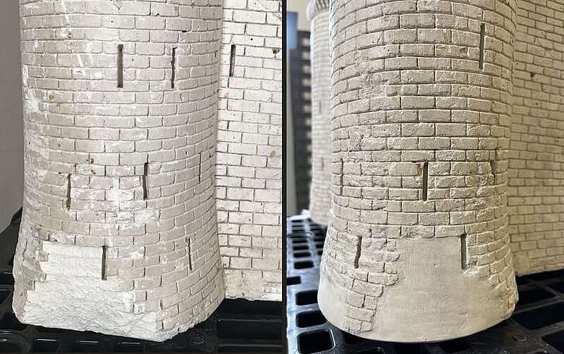 Les éléments issus d’une ancienne restauration ont ensuite été minutieusement éliminés afin de retrouver les surfaces d’origine. Ces anciens comblements étaient principalement situés au niveau de la base et du sommet des tours. Seuls les plus gros manques ont été partiellement restitués.